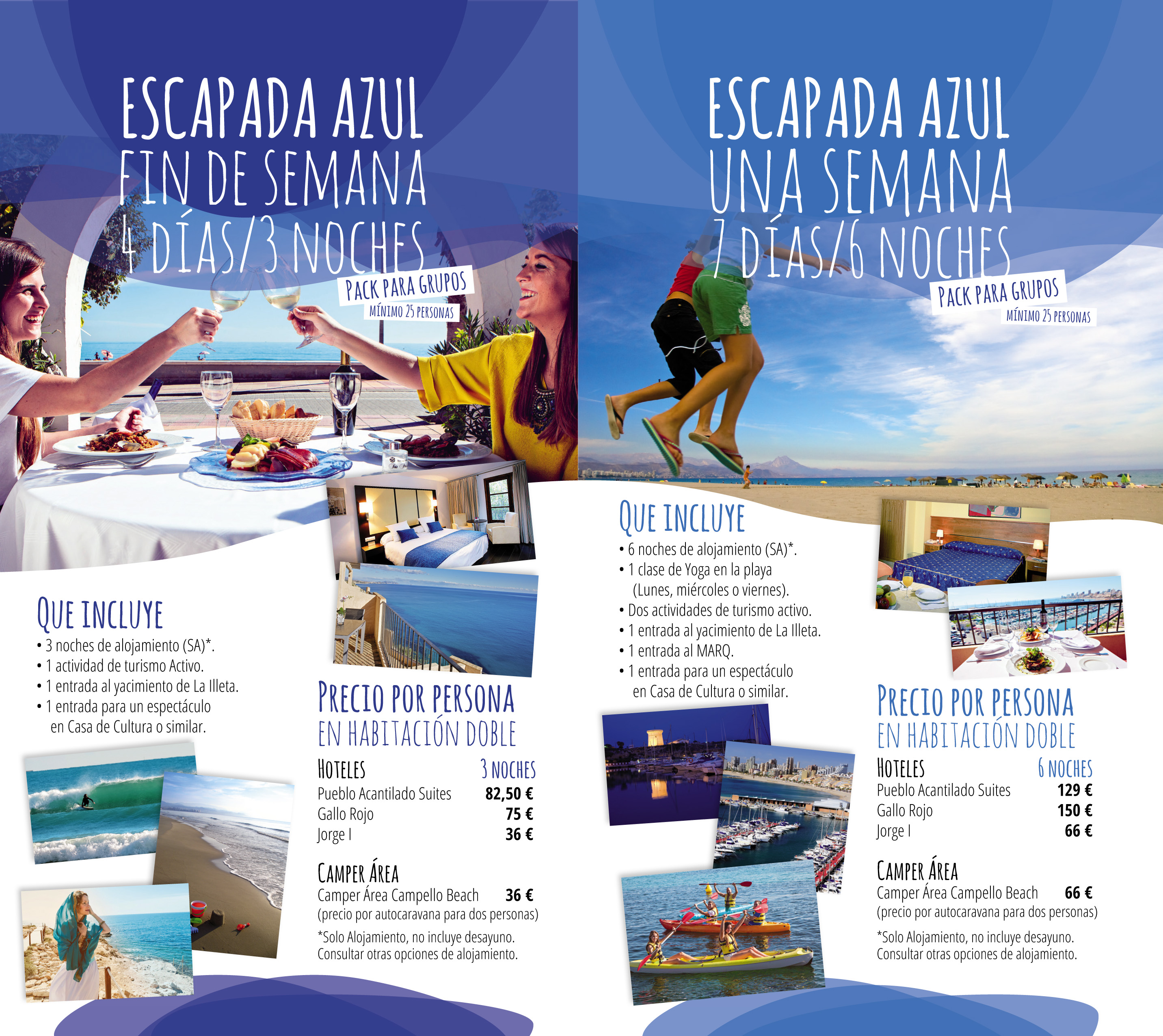 Ya sabéis, en pareja, en familia, con amigos, con los compañeros del cole o del instituto… ya no hay escusas para descubrir y disfrutar el Mediterráneo en #ElCampello ¡Venga! llama al establecimiento elegido: Pueblo Acantilado Suites, Hotel La Familia Gallo Rojo, Hotel Mar Azul, Hotel Jorge I o Camper Área Campello Beach (para autocaravanas), reserva el paquete que más te guste (verde o azul) y empieza a hacer la maleta 😉 ¡Aquí os esperamos!