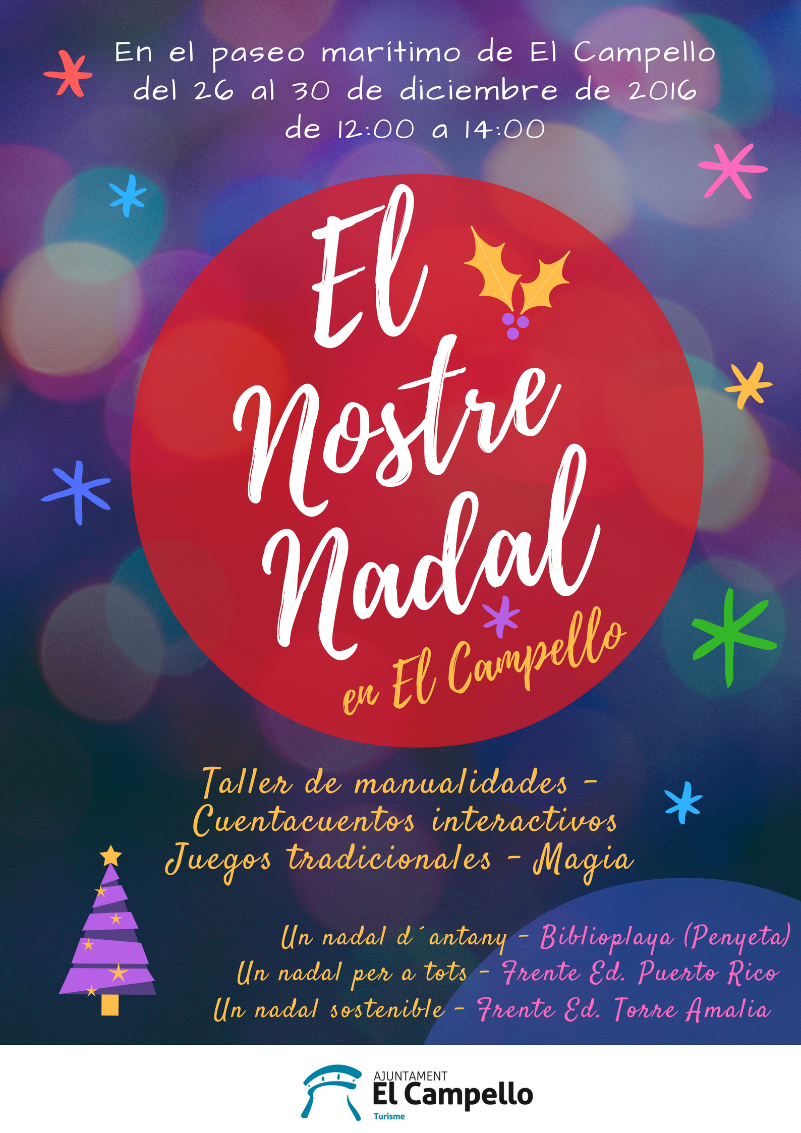 De 12.00 a 14.00 horas EL NOSTRE NADAL. Talleres navideños, cuentos, juegos, magia, etc. en tres emplazamientos del Paseo Marítimo del Carrer la Mar: Frente a la Biblioplaya, Edf. Puerto Rico y Edf. Torre Amalia. Una Navidad de Antaño (tradiciones navideñas en El Campello). Una Navidad para todos (las diferentes maneras de celebrar la Navidad en el mundo). Una Navidad Sostenible (Taller destinado a fomentar la imaginación y la creatividad con materiales reciclados). Paseo Marítimo. Tres lugares . E. Libre (todos los públicos).