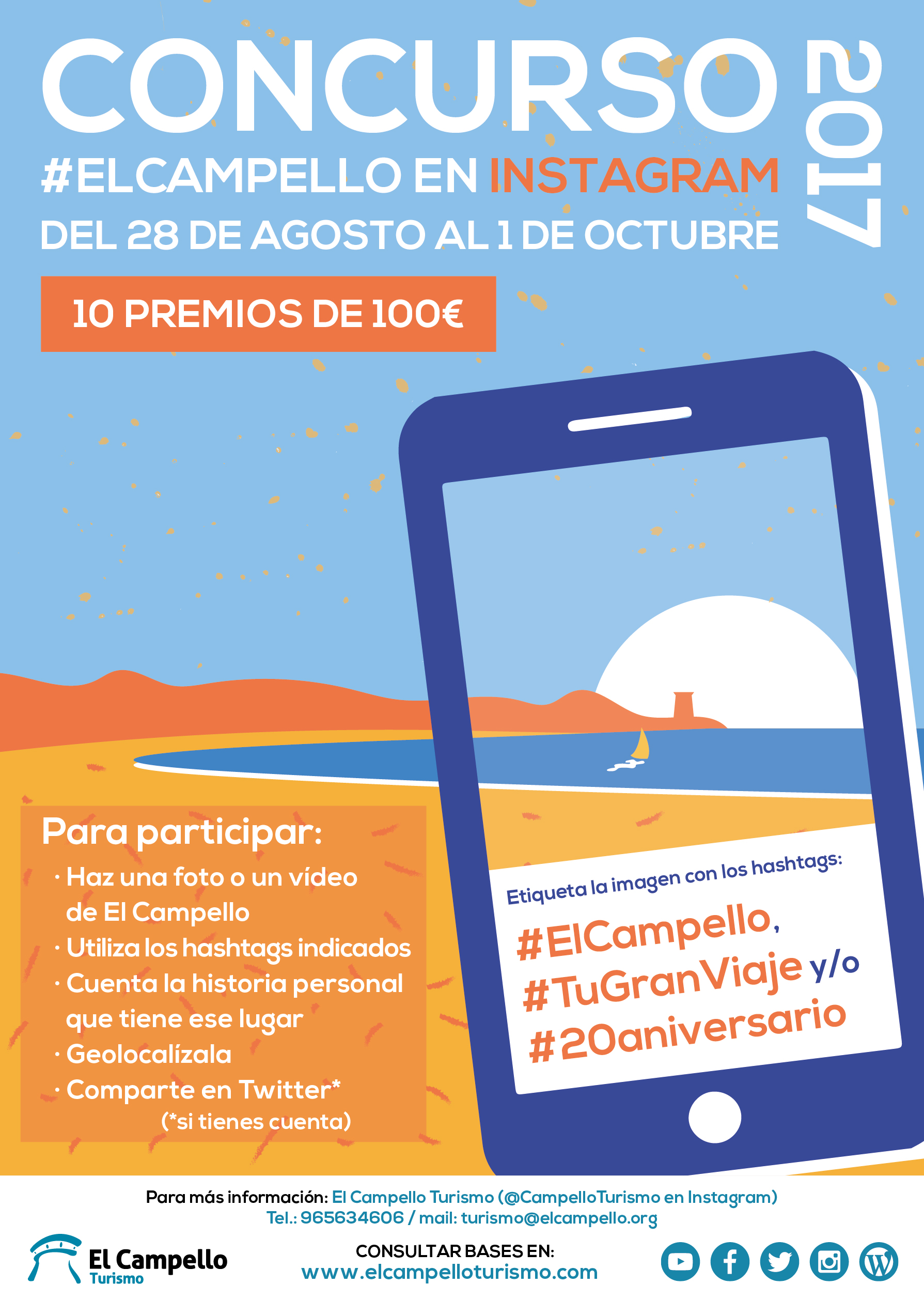 Para participar en el concurso, basta que publiquéis vuestras fotos o vídeos de El Campello en Instagram, acompañándolas con el hashtag #ElCampello para que podamos localizarlas, más los hashtags #20aniversario y/o #TuGranViaje, que identifican la campaña de este año. No olvidéis geolocalizar las fotos, para que se vea claramente que las habéis hecho en El Campello, y si tenéis cuenta en Twitter ¡compartidla también! Que todo el mundo sepa lo bonito que es nuestro municipio 🙂 ¡Ah! Es muy importante que vuestra cuenta sea pública, para que podamos todos ver las imágenes (si la cuenta está protegida, no podrá participar en el concurso)
