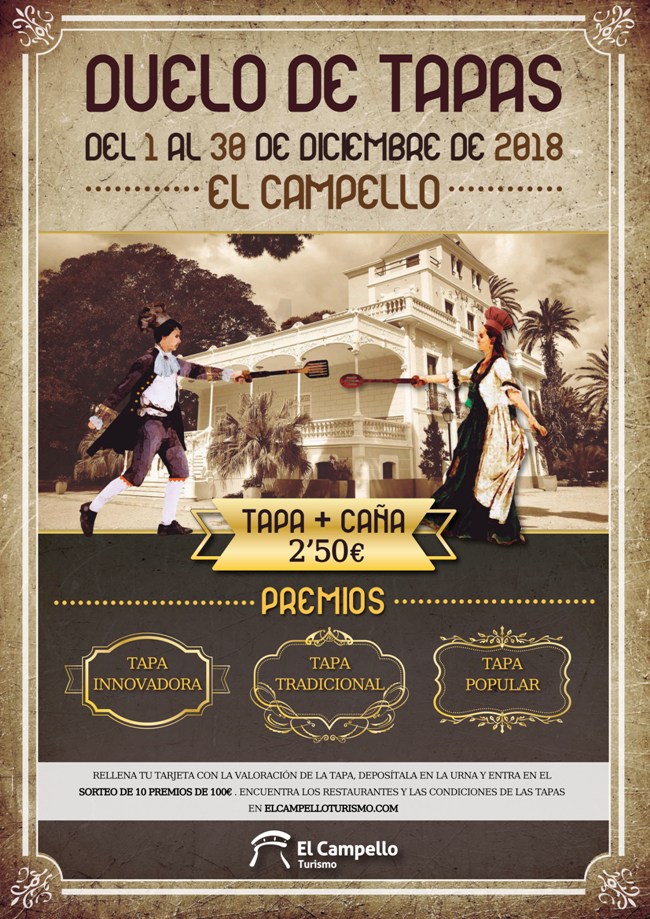 Del 1 al 30 de diciembre, por sólo 2,5€ (tapa + caña), disfruta de la ruta de tapas 2018 en El Campello ¡¡nuestro IV Duelo de Tapas! Y por dar vuestra opinión, podéis ganar uno de los 10 vales de 100€ que esperamos consumáis en los restaurantes participantes.