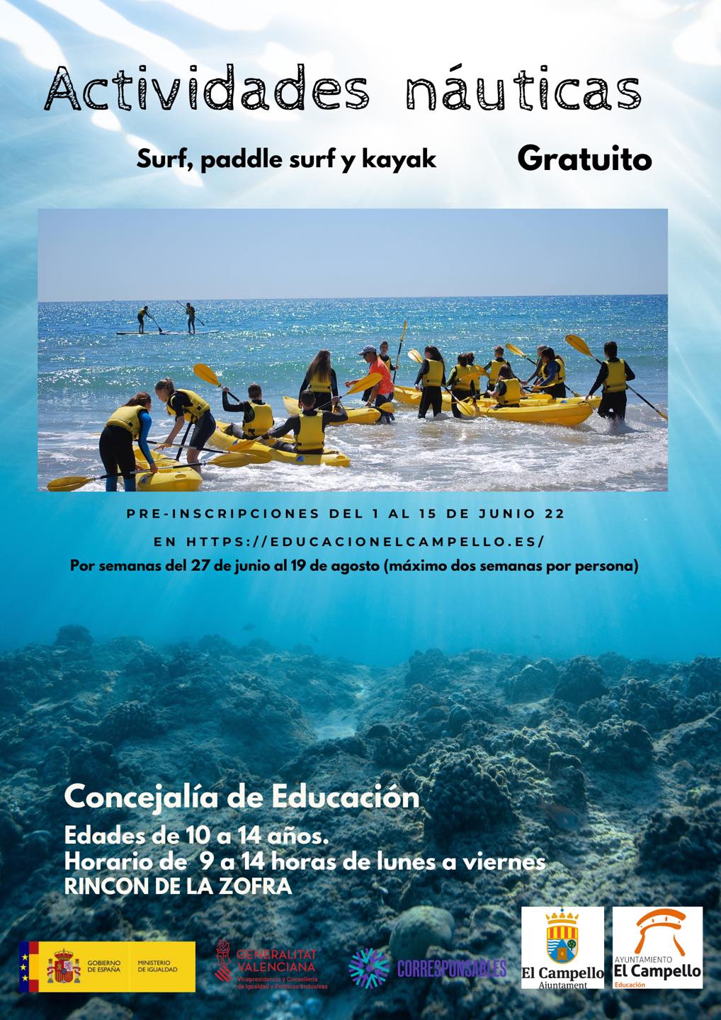 - Actividades náuticas impulsadas por la Concejalía de Educación – surf, paddel surf y kayak en el Rincón de la Zofra para niños y niñas de 10 a 14 años. Serán por semanas desde el 27 de junio al 19 de agosto. El 15 de junio finaliza el plazo de inscripción.