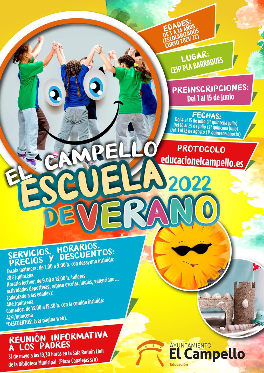 - Escuela de verano impulsada por la Concejalía de Educación. Lugar CEIP Pla Barraques. Preinscripciones del 1 al 15 de junio.