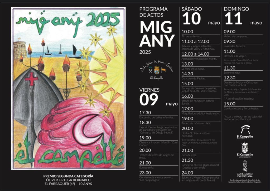Del 9 al 11 de mayo de 2025, El Campello se viste de gala para celebrar su Mig Any. Durante tres días, el Polideportivo Municipal y el centro urbano acogerán un amplio programa de actividades que incluye: