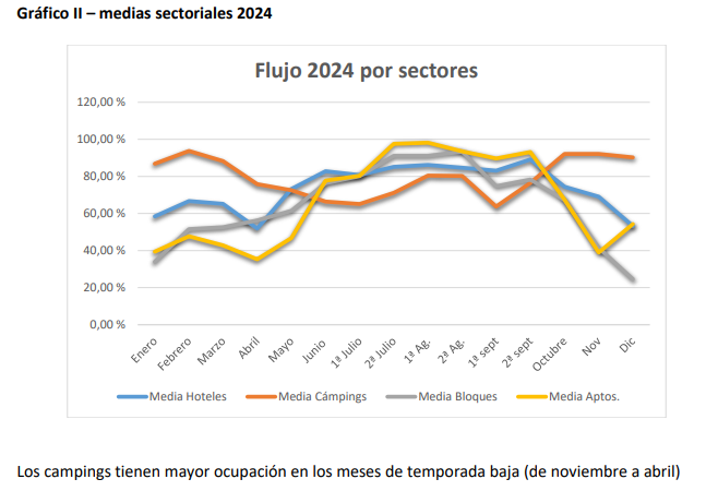 Esta oferta alojativa a influido en gran medida en los procesos de ruptura de la alta estacionalidad. Los últimos informes de ocupación turística de El Campello reflejaron cifras significativas. En 2024, el municipio alcanzó una ocupación media anual del 71,28%, con picos del 82,5 % en verano. Pero el dato más revelador es que los campings y áreas camper superaron el 90 % de ocupación en los meses de invierno, evidenciando su papel determinante en las cifras durante la temporada baja.